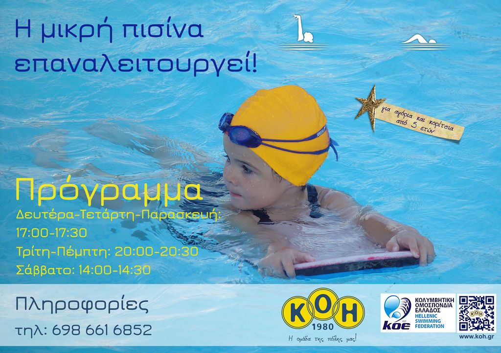 Όπως ανακοίνωσε η Διεύθυνση του Εθνικού αθλητικού Κέντρου Ηρακλείου η πισίνα εκμάθησης (μικρή πισίνα) επαναλειτουργεί από την Πέμπτη 8 Ιουλίου 2021.