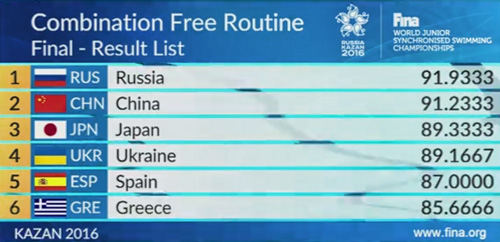 Η ελληνική ομάδα αποτελούμενη από τις Μαρία Ελένη Αρμάου, Ιφιγένεια Δίπλα, Βαλεντίνα Φαραντούρη, Βασιλική Κοφίδη, Όλγα Κουργιαντάκη, Σοφία Eυαγγελία Μαλκογεώργου, Αναστασία Ταξοπούλου, Άννα Μαρία Ταξοπούλου, Δήμητρα Τσιαντή, Αθανασία Τσόλα, αναπλ. Θάλεια Παπαδοπούλου, Όλγα Παπασαράντη, εκτέλεσε ένα εξαιρετικό και μεγάλης δυσκολίας πρόγραμμα και βαθμολογήθηκε με 85,6666 βαθμούς. Το χρυσό μετάλλιο πήρε η Ρωσία με 91,9333 βαθμούς, ενώ η Κίνα κατέκτησε το ασημένιο μετάλλιο με 91,2333 βαθμούς. Στο τρίτο σκαλί του βάθρου ανέβηκε η Ιαπωνία με 89,8333 βαθμούς.